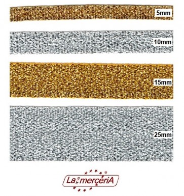 Nastro gros lamé in poliestere (50% poliestere e 50% lamé), altezza 15 mm; confezione in pezze da 10 metri, colore oro o argento.