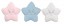 Applicazioni ricamate stellina, dimensioni 60x60mm. Confezionate in busta trasparente con istruzioni per l'uso, tre pezzi assortiti nei colori rosa, azzurro e bianco.