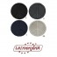 Applicazioni ricamate su tessuto termoadesivo, diametro 35mm; confezione in buste trasparenti da quattro pezzi, col.5-nero, 7-blu, 20-beige e 3-grigio, oppure assortiti.