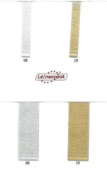 Nastro raso satin lusso con lurex confezionato in rotoli da 20metri, disponibile nelle varianti 08-bianco/argento, 19 panna/oro.
